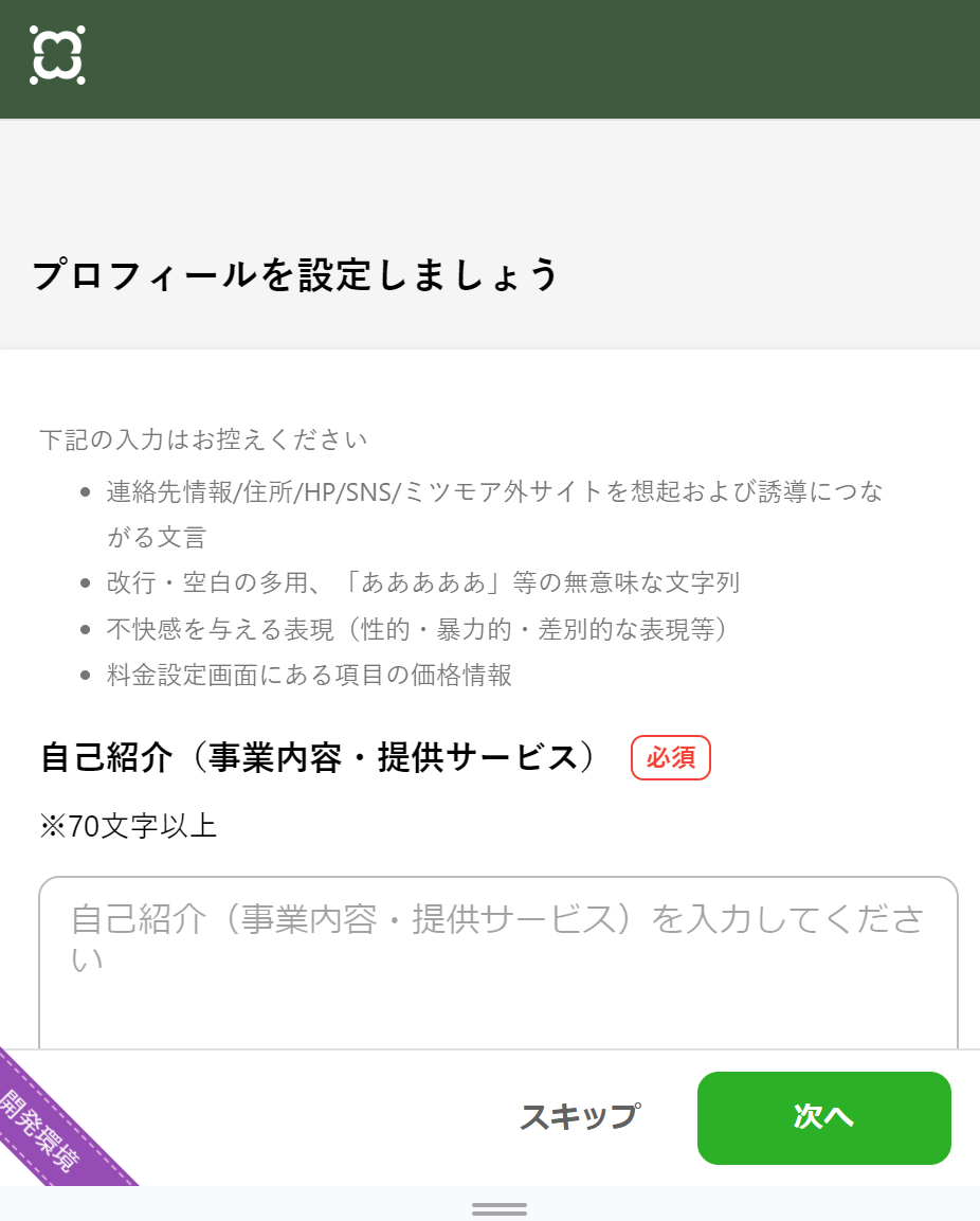 ※プロフィール:【自己紹介】欄には70文字以上の入力が必須です。 - 集客に必要な設定を行います。