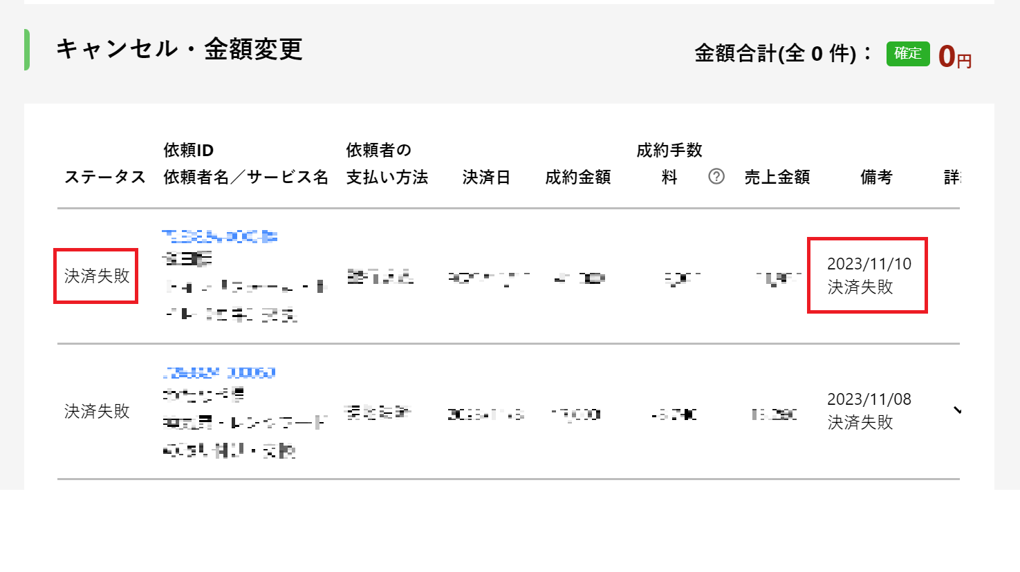 対象の案件は、売上管理画面の成約手数料をご確認ください。手数料をクレジットカード決済でお支払いいただけていない場合、下図のようにステータスおよび備考に「決済失敗」と表示された項目が存在します。